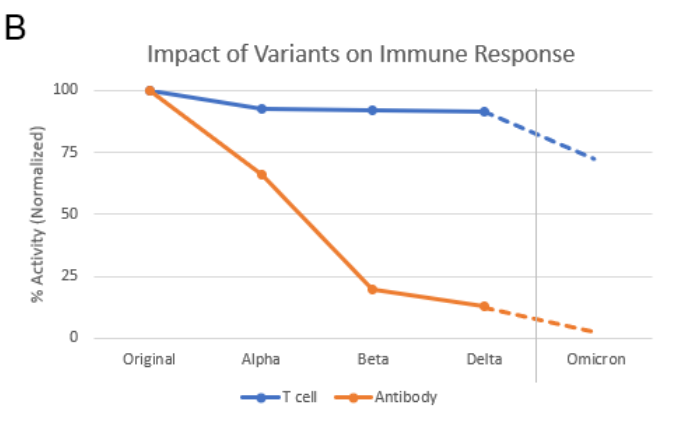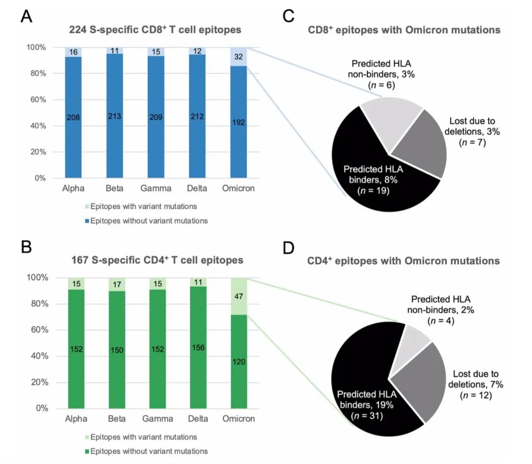 研究发现,尽管20%的CD4+ T细胞表位可能受到影响,但据估计,CD4+ T细胞介导的免疫损失略高于30%,因为一些受影响的表位相对更具免疫原性。对于CD8+ T细胞,他们估计损失约20%。再加上抗体的中和性预期大幅下降,新冠疫苗提供的整体保护可能受到不利影响。