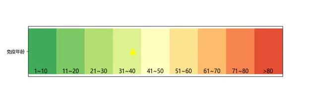 根据不同年龄阶段的免疫力进行评估,受检者(黄色三角)免疫年龄越接近绿色,免疫系统越年轻。用直观的数据看到自己的免疫情况。