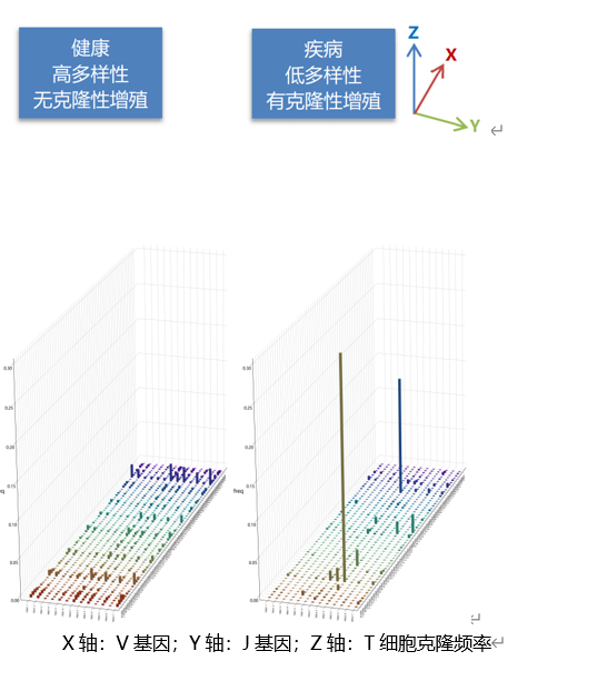 TCR测出来是什么样呢?一个健康人测出来是这样的:一根竖线代表了一种已知V基因/J基因的TCR重组基因频率,竖线越多,表示T细胞的种类越多,T细胞的多样性越高;竖线越长,表示这种T细胞受体的T细胞克隆频率越多。3D森林图直观的显示了受检者T细胞受体(TCR)的多样性。T细胞多样性越高,越有能力抵御疾病。在这个图中可以明显看到疾病患者和健康人的区别,疾病患者出现明显的克隆性增殖。
