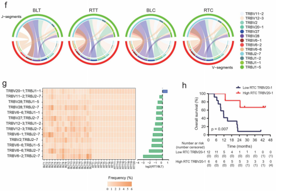 在基线肿瘤中发现的V-J配对片段中,TRBV20-1/TRBJ1-1对是唯一一个在治疗期间频率增加的片段(图4g)。在治疗期间的外周血CD8+ T细胞中,TRBV20-1水平较高的患者的OS更好(图4h)。