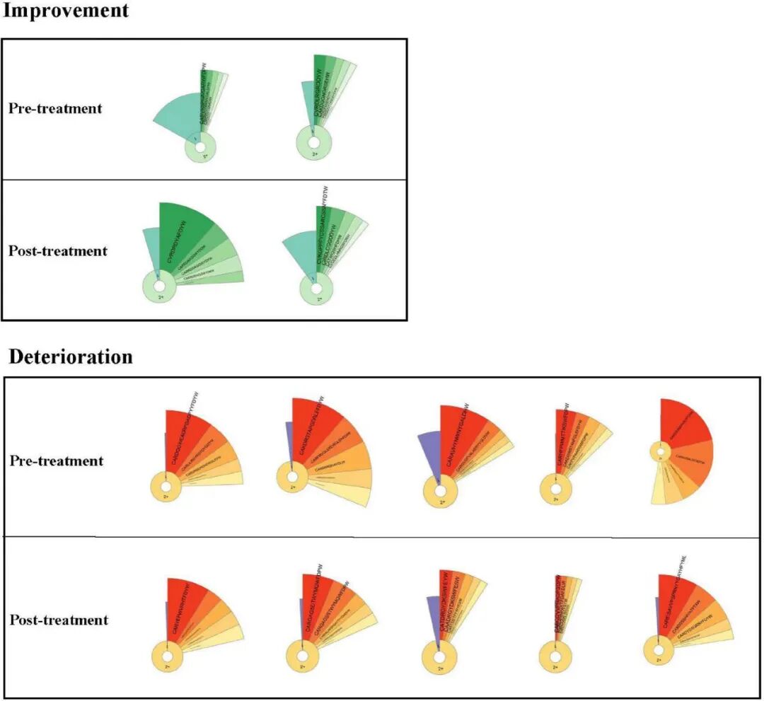 图. IGH 的蜗牛图。七名患者在治疗后和治疗前的蜗牛图。扇形区域描绘了相应的克隆频率。图中“1”的区域代表测序测到1次的频率。弧度面积越大意味着的克隆频率越高。图中显示了 IGH 的互补决定区 (CDR3) 的前五个克隆的氨基酸序列。