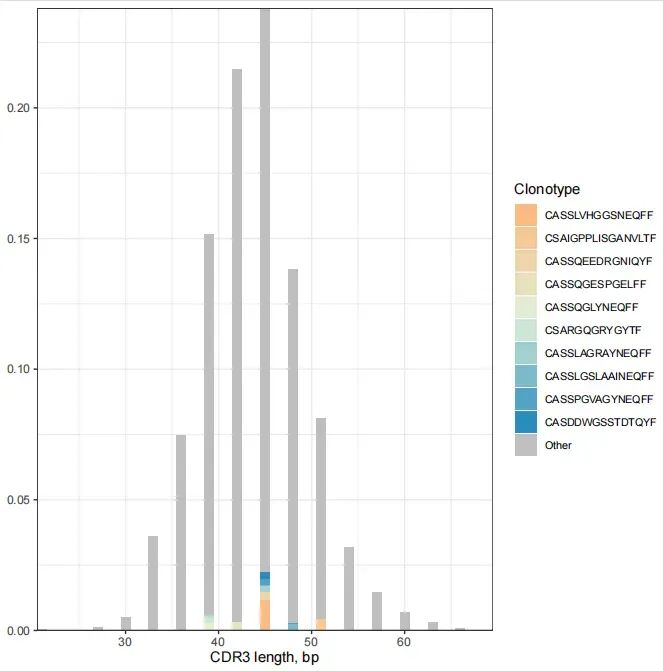 艾沐蒽提供的各个样本的Top10 CDR3序列长度分布柱状图按照频率选取Top10以及其他(Other)克隆(以CDR3的氨基酸序表示)的CDR3核酸长度分布,X轴为CDR3核酸长度,Y轴是频率,不同颜色表示不同克隆,彩色表示Top 10克隆,灰色的表示除Top 10以外的其他克隆。