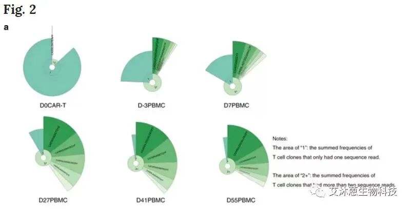 在艾沐蒽合作发表的《Quantitative characterization of T-cell repertoire alteration in Chinese patients with B-cell acute lymphocyte leukemia after CAR-T therapy》,通过ImmuHub® TCR测序,对中国白血病患者CAR-T治疗后T细胞组库(TCR)变化进行研究。如下图所示,通过TCR测序对B-ALL患者CAR-T治疗前和治疗后多个时间点的外周血和骨髓样本进行研究。蜗牛图结果表明经过CAR-T治疗后,患者的外周血和骨髓中均会出现明显的T细胞克隆性增殖。