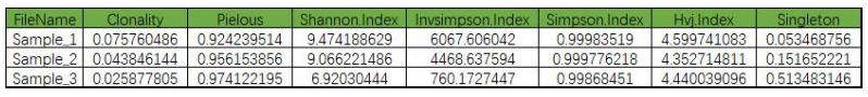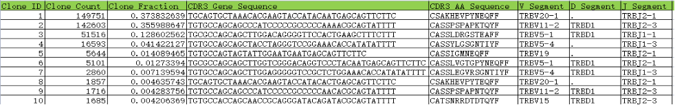 图2 (1)Clone ID:每种克隆编号,从0开始按顺序编号。如有未出现的编号,表示该克隆为out-of-frame或中间有Stop Condon的,通常认为是不表达的克隆,在数据分析时一般会被过滤掉 (2)Clone Count:每种克隆的总数 (3)Clone Fraction: 表示每种克隆占总TCR克隆种类的频率的百分比 (4)CDR3 Gene Sequence: CDR3核酸序列 (5)CDR3 AA Sequence: CDR3氨基酸序列 (6)V/D/J Segment: VDJ基因片段ID