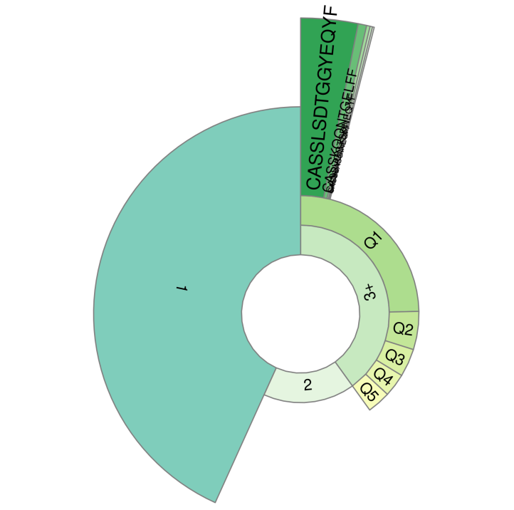 第二层的Q1-Q5表示每20%的TCR克隆序列所占的比例(TCR克隆频率由高到低排序),这能直观反映TCR克隆性。