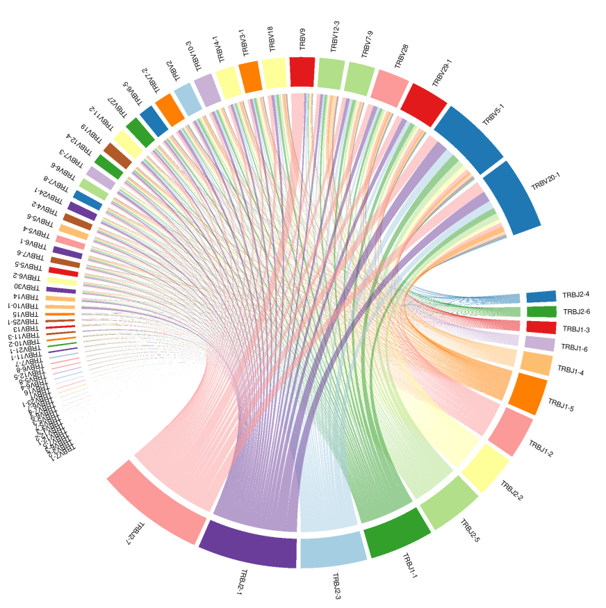 图4V -J 基因片段组合图体现的是各个样本的V-J基因片段使用频率和组合频率,可说明免疫系统多样性。如图所示,每一个色块代表一个基因片段,上段为 V 片段,下段为 J 片段,色块越宽代表这个片段使用频率越高,连线越多,表示这种 V-J 组合频率越高。