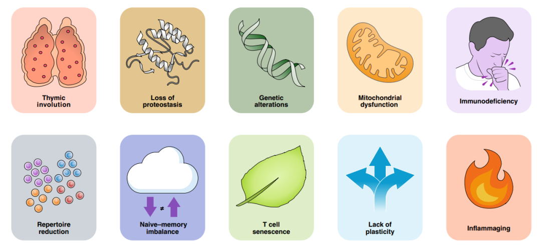 总之,现有数据表明,由于胸腺退化、持续的抗原刺激和炎症环境,高度分化的记忆T细胞富集,而初始库里的初始T细胞减少。