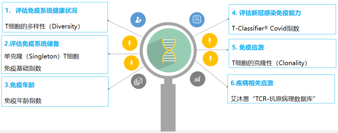 艾沐蒽基于Immun-Cheq®对受检者血液中的T细胞进行TCR测序分析,而分析T细胞的多样性(Diversity)、免疫储备能力(初始T细胞比例)、免疫年龄、新冠感染免疫指数以及T细胞克隆性(Clonality)和对疾病相关的TCR筛选,进而分析受检者的免疫系统健康和身体应激状况。