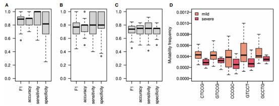 由于冷点基序的突变性在重症和轻度患者之间变化最大,作者仅使用该冷点的突变性评分建立了一个模型。在严重程度分类中,获得的F1评分和准确性约为0.75(图4C)。与重症患者相比,所有轻症患者的非零系数模式都有更高的突变频率(图4D)。