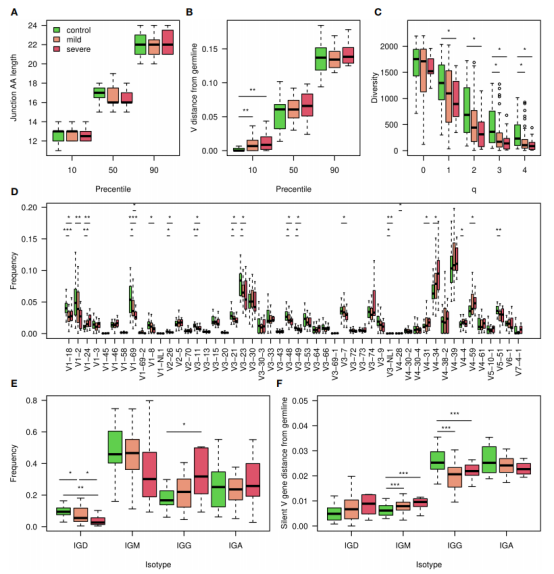比较不同组之间的isotype频率发现,SARS-CoV2感染后IGD和IGM的频率降低,IGG的频率升高,而IGA的频率保持不变(图1E)。每个isotype的沉默突变(silent mutability)频率比较:感染后IGG和IGA的突变性降低,IGD和IGM的突变性增加,重症患者更高(图1F)。