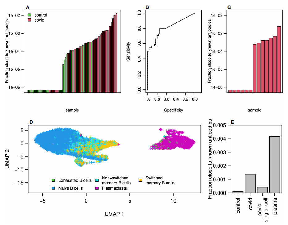作者计算并总结了测序得到的抗体库与已公布的已知SARS-CoV2抗体相似的序列的频率。COVID-19患者中与已知抗体相似的频率高于对照组(图5A)。利用与已知COVID-19克隆相似的频率之和,我们在曲目分类中达到了70%以上的准确率,AUC为0.81(图5B)。