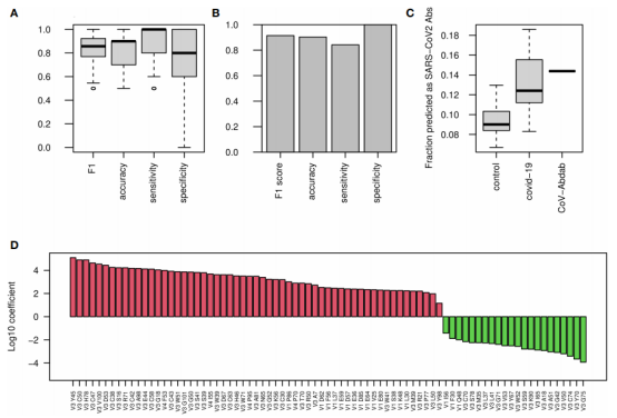 作者生成了一个包含10300列的表,为5个最常用的V基因家族(IGHV1-5)沿103个V基因位置(根据IMGT编号对齐)计算AA频率。使用这种方法获得了超过0.85的高 F1分数,以及相似水平的准确性、灵敏度和特异性(图 2A). 外部测试组的F1分数也高于0.85(图2B).作者提取了该算法使用的系数,对应于每个AA频率对疾病分类的贡献(图2D).另外作者计算了来自CoV-AbDab数据库中5000多种已知的抗SARS-CoV2抗体的这些分数,已知抗体的评分高于对照组以及大多数COVID-19感染库的评分(图2C),表明这些系数不仅对库水平有意义,而且对单个BCR序列也有意义。