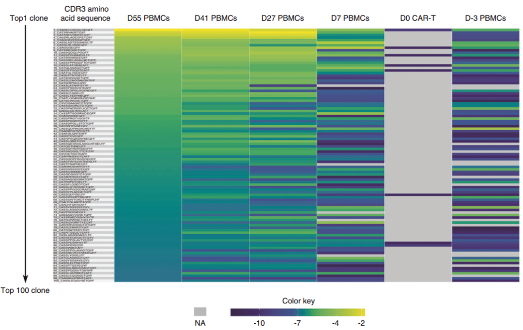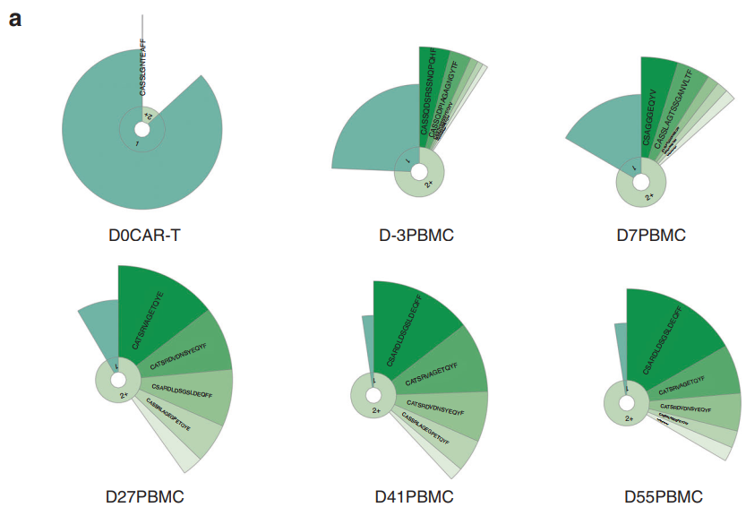 在CAR-T治疗后的早期阶段,CAR-T细胞的扩增速度很快,但是在治疗后的后期阶段,CAR-T细胞的扩增速度逐渐减慢,并且克隆组成开始发生变化。