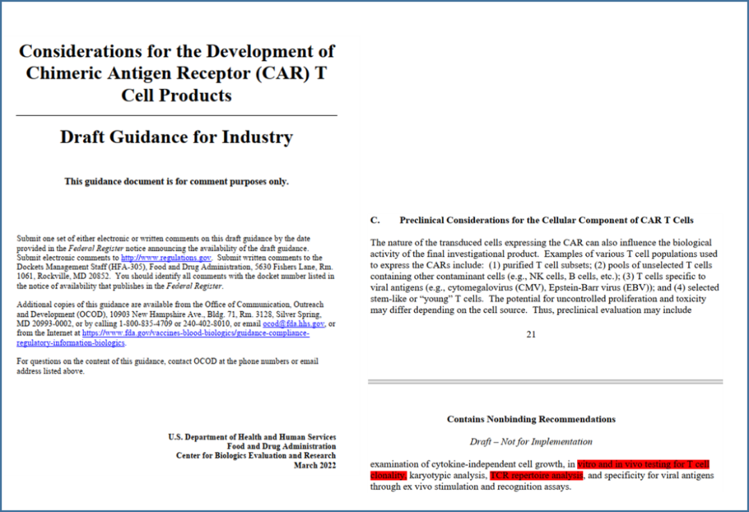 1、CAR-T细胞的克隆性检测和持久性检测 ①CAR-T细胞的克隆性检测 FDA草案中提及临床前先需评估CAR-T的TCR克隆构成和克隆性,以防止不受控制的增殖和毒性。关于CAR-T产品的质控是非常重要的环节。