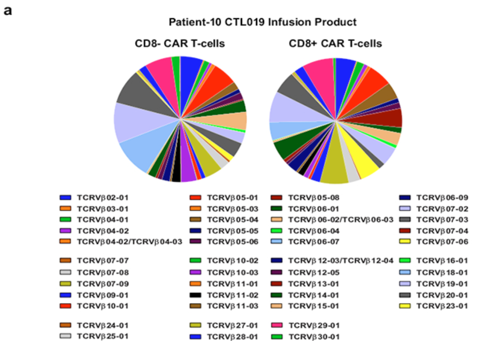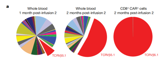 Fig. Frequency of TCRVβ gene segment usage in the blood of Patient-10 one month (left) and two months (middle) after the second CAR T cell infusion. Joseph, F. et al.在Nature上发表相关成果,数据表明通过TCR NGS测序对 CAR-T细胞产品检测克隆构成,TCRVβ具有高度多样性,输注后CAR-T TCRVβ5.1克隆高度增殖并持久存在从而对抗肿瘤。