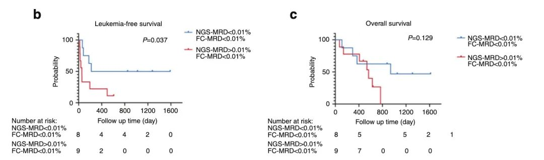 数据表明,FC检测所有患者的 MRD结果均为阴性,而Seq-MRD®能检测到CAR-T治疗后MRD 水平 > 0.01%患者的 LFS 和 OS 均低于MRD < 0.01% 的患者。说明Seq-MRD®相比FC,更适合应用于CAR-T治疗的MRD检测,能更准确预测患者预后(Figure b&c)。