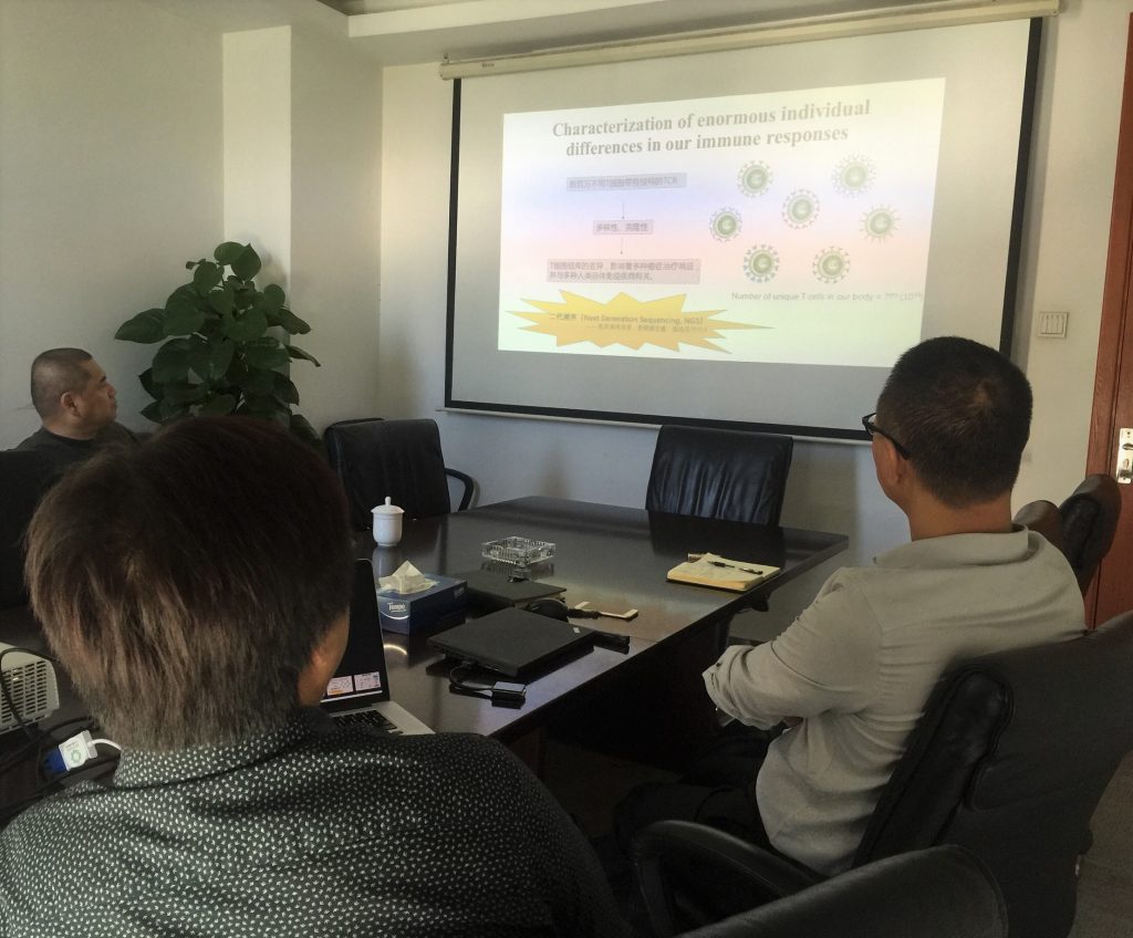 随后,艾沐蒽生物CEO孙涛做了场有关“基于二代基因测序技术的免疫系统检测和评估” 的报告,并对艾沐蒽生物的发展方向做了介绍。长和生物戴总、徐总对艾沐蒽生物在免疫组库高通量测序技术方面的实力及所做的临床研究成果给予高度肯定,提出可在高端体检Immun-Cheq产品方面开展业务合作以及干细胞治疗方面开展研究合作,同时,徐总对艾沐蒽生物公司产品在未来市场发展方向上给出多项建设性意见。