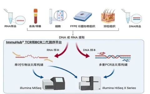 ImmuHub®技术平台是基于第二代高通量基因测序平台利用5’RACE或多重PCR技术,使我们能直接从基因组RNA或DNA来扩增TCR/BCR的全长序列或CDR3区序列,从而进行高通量测序和数据分析。是艾沐蒽开发的一套灵活度极高的TCR/BCR二代测序平台