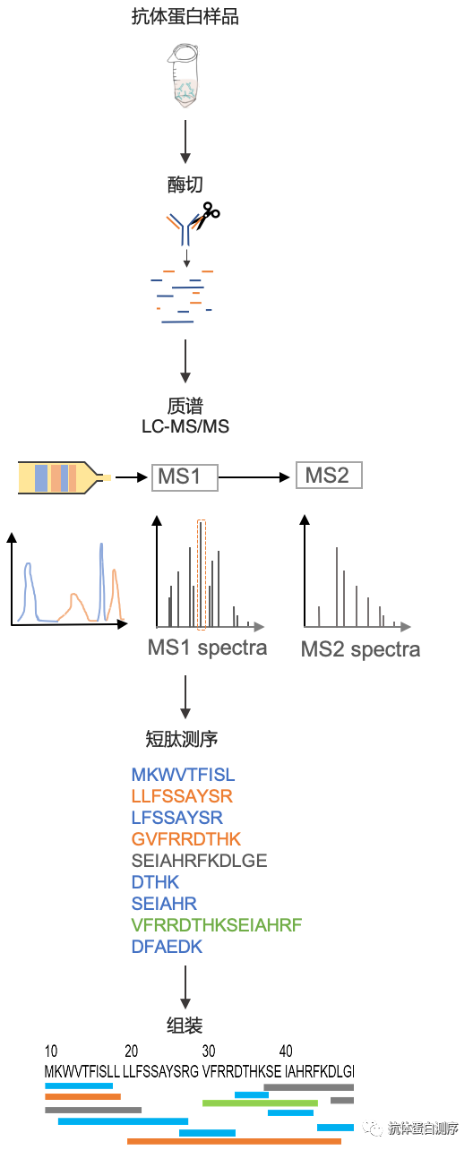 4.     组装:利用生物信息学与大数据分析,将短肽序列组装回完整的抗体蛋白质序列,从而得到蛋白完整的氨基酸序列。