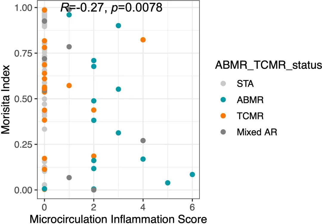 微循环炎症(MI)是一个累积评分,包括肾小球炎(gs)和小管周围毛细血管炎(ptc),与肾移植预后较差相关(23)。在移植后样本中,心肌梗死评分与Morisita指数之间存在显著相关性(spearman’s Rho=-0.27, p=0.0078,图5)。在移植后样本中,Morisita指数小于0.3的患者中,43.5%的患者心肌梗死>0,而心肌梗死=0的患者为15.7% (Fisher精确检验,p=0.009)。这表明高周转率可能与更严重的排斥反应有关。