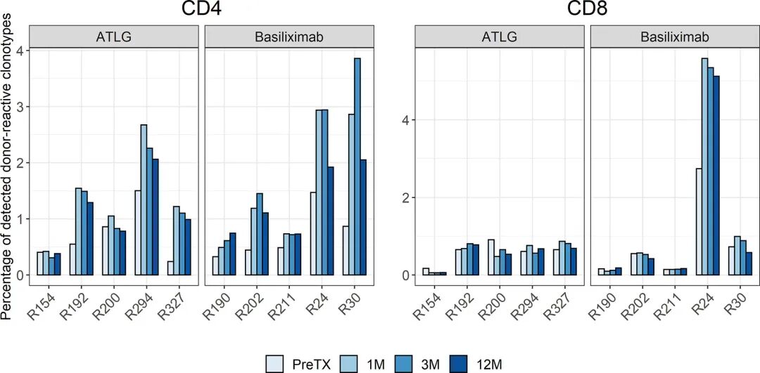 图6显示了所有患者在所有时间点的供体反应性克隆型的百分比,并在补充表7中显示。正如预期的那样,在移植后观察时间内,巴利昔单抗治疗组所有受试者的CD4T细胞中供体反应性克隆型的数值增加。然而,在ATLG组中,两个人供体反应性细胞的增加不太明显,这可能是由这些受试者长期淋巴细胞减少引起的。