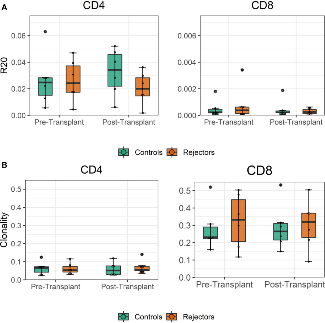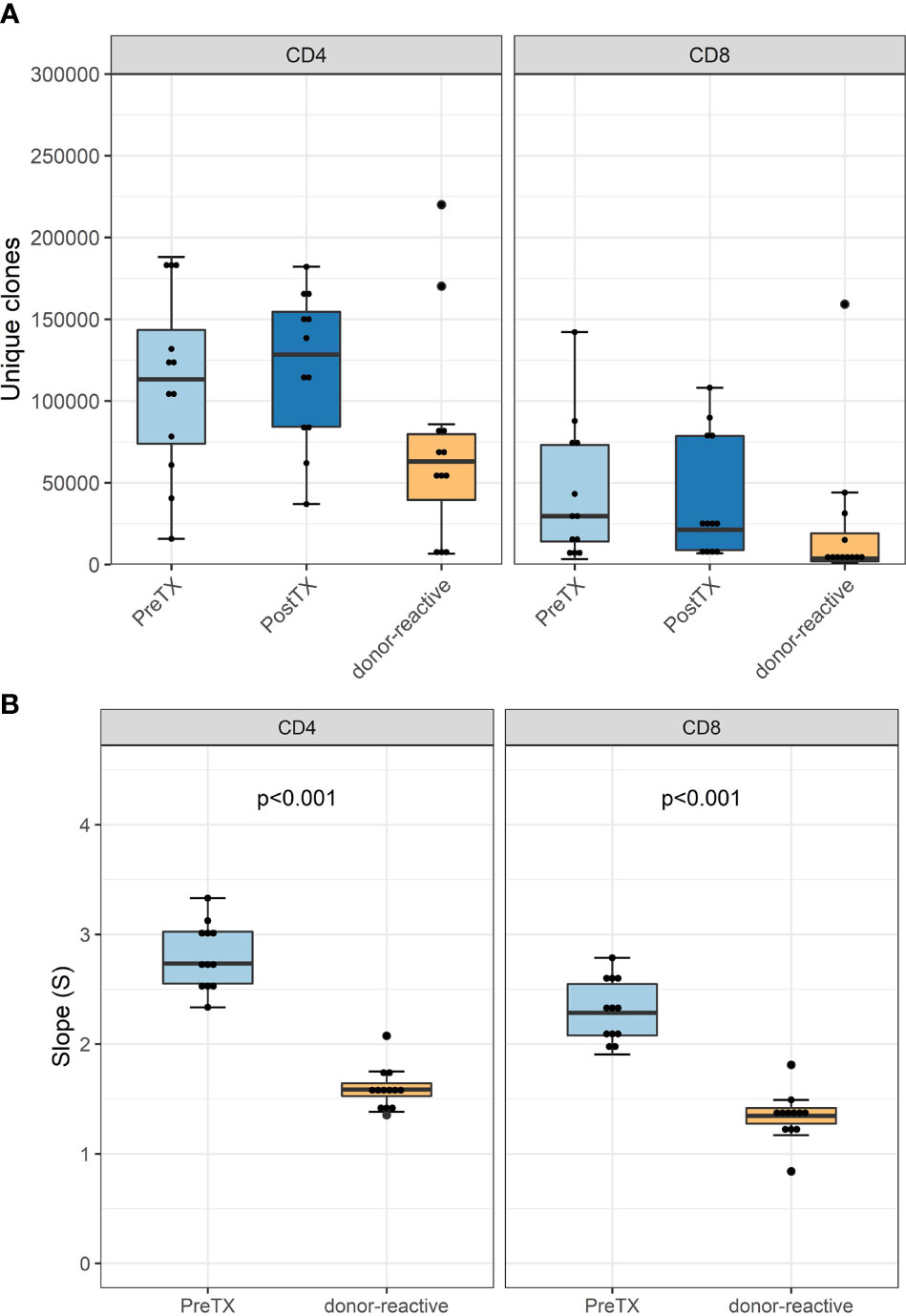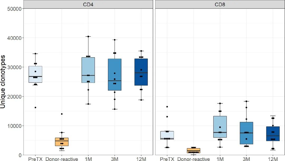 通过克隆性测量的移植前基因多样性,CD4细胞为0.018-0.13,CD8T细胞为0.13 – 0.5。