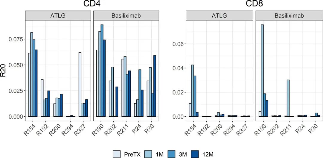R20测量,免疫优势的度量,显示两个队列没有分离,表明在减少剂量ATLG治疗后,总体TCR库中克隆优势没有增加(图3)。诱导治疗后CD4和CD8阳性T细胞的R20是稳定的,在移植后的所有时间点没有观察到统计学差异(CD4: F(3, 24)=0.85 p= 0.479;CD8: F(1.19, 9.52)=0.79, p=0.418)。在ATLG治疗组的一个受试者(R294)中有一个高度丰富的克隆,占整个T细胞库的10%以上,并且在移植前和移植后的每个时间点都有发现,这是该患者低R20值的原因。