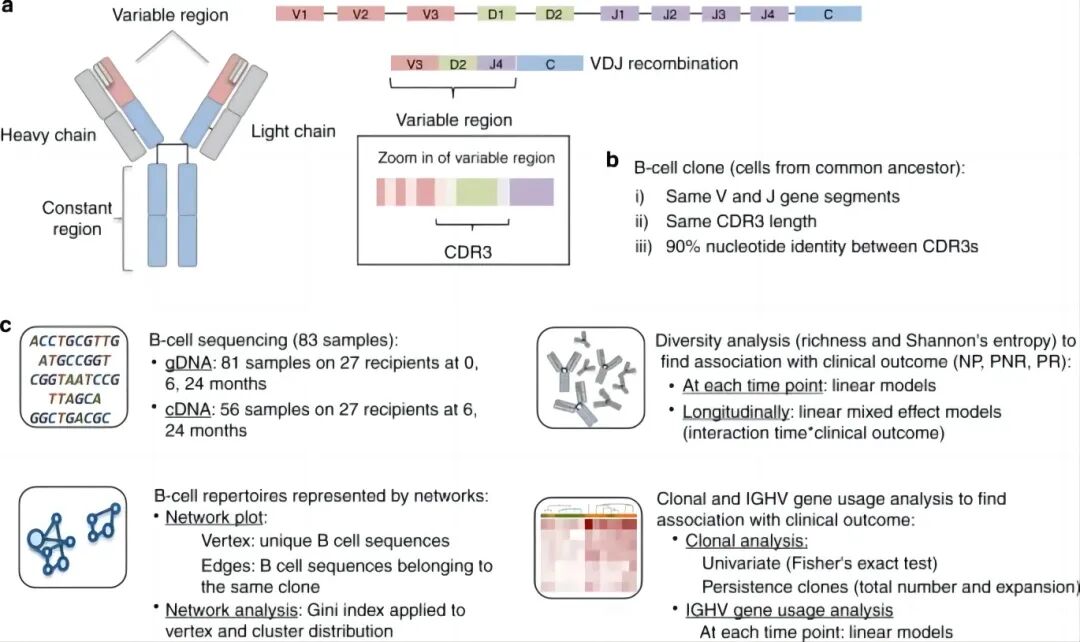作者不仅通过临床结果来描述B细胞库,还提供移植前和移植后免疫反应的全局图像,数据也使作者能够在克隆和IGHV基因水平上进行Ig序列特异性分析。