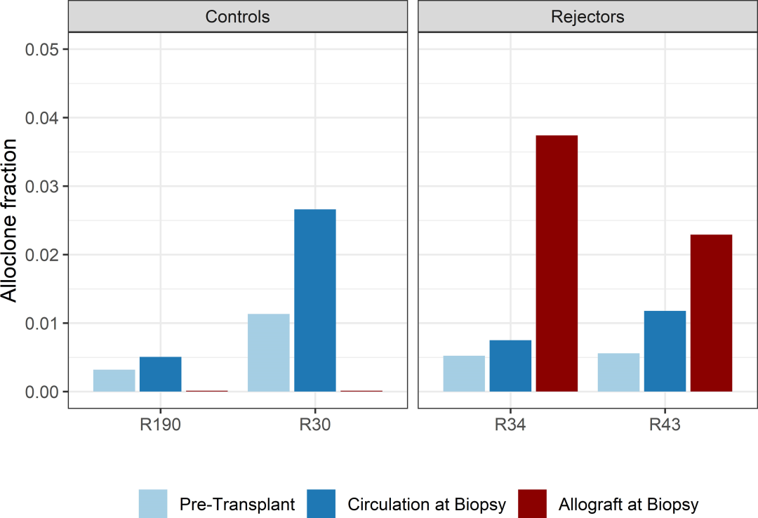 为了证实这些发现,通过对七个经过细胞排斥反应的肾移植受者的活检和血液样本进行了类似的队列分析。
