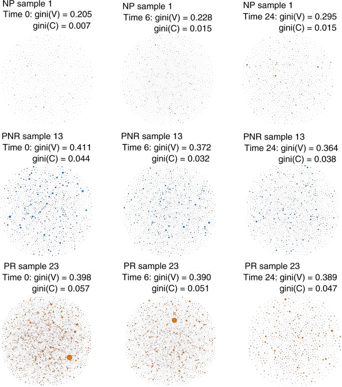 在图4中,展示了三个临床结果组在三个不同时间点(移植前、移植后6个月和24个月)代表性B细胞库之间视觉和数量显著差异。在PR库中,与NP相比,大量形成更多更大克隆簇的B细胞序列存在,而PNR位于两者之间。随着时间的推移,PR组与NP组相比,BCR和特殊克隆的数量有所减少。本研究中每个个体的详细B细胞网络如图5-7所示。在NP组发生PTLD的个体中,观察到非常多样化的B细胞网络模式(补充图5),移植前没有B细胞扩增,6个月后B细胞增加,移植后24个月出现明显的克隆扩增,同时多样性下降。