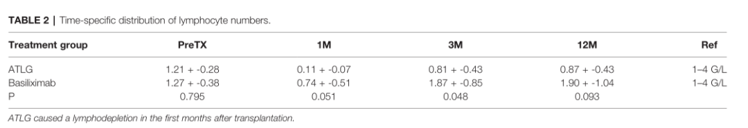 肾移植后诱导治疗后,ATLG组在第一个月内平均淋巴细胞耗损达到0.11+-0.07 G/L。队列中的淋巴细胞减少状态持续了至少14天,其中2例患者在310天淋巴细胞计数恢复到>1G/L, 3例患者在整个观察期内淋巴细胞计数持续减少。巴利昔单抗治疗组的淋巴细胞计数在移植后的第一个月也有所下降,但在随后的时间点中所有受试者的淋巴细胞计数均上升至>1G/L(表2)。移植后12个月通过肾小球滤过率(eGFR)估计的移植功能在两组之间没有差异(ATLG组:64+-18ml/min/1.73m²,巴利昔单抗治疗组:53+-12 ml/min/1.73m²;P=0.23)。
