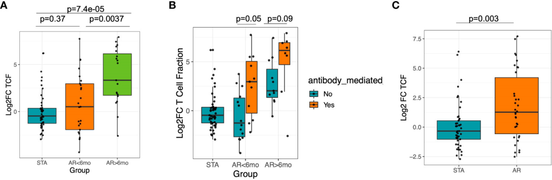 当进一步将排斥患者分为ABMR和非ABMR时,无论发生排斥的时间如何,ABMR组的TCFr显著增加(AR ABMR vs STA, Wilcoxon P=0.04, AR非ABMR vs STA Wilcoxon P=0.56)(图3B)。