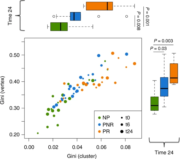 在基尼指数测量的进一步评估中(图5),PR组在顶点和簇的测量值均明显高于NP组,这表明PR组患者在基线时具有更高的克隆扩增。