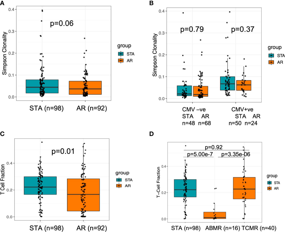 在移植前阶段,从移植后出现急性排斥反应的受试者收集的外周血样本中观察到更大的T细胞库多样性(图2A)。使用先前发表的方法(21),推断受试者在基线时的CMV状态;然而,它不能区分潜伏性感染和活动性感染。与STA组相比,AR组中CMV naïve的患者数量明显更多(51% vs.26%;精确P=0.0005)。