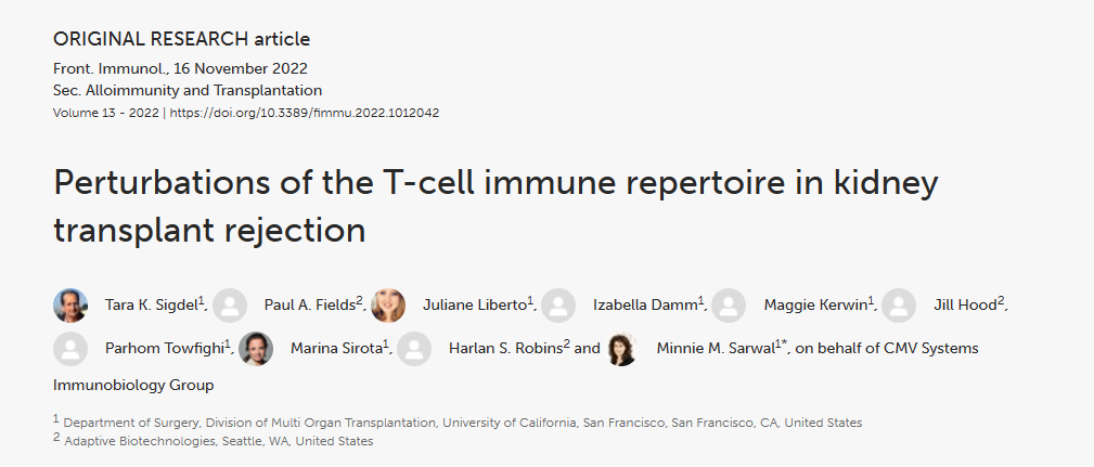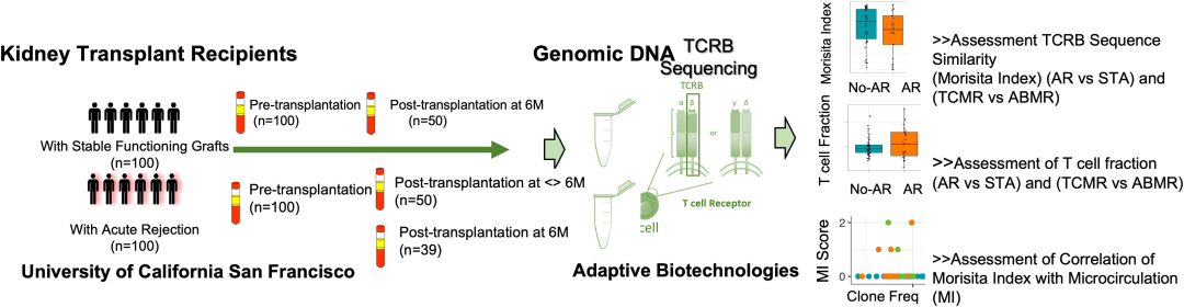在本研究中,通过评估了大量成人肾移植患者的TCR免疫库,以便能够辨别T细胞克隆和移植时间之间的低频变化,组织学证实的急性排斥反应,以及T细胞或抗体介导的排斥反应的任何特异性变化。