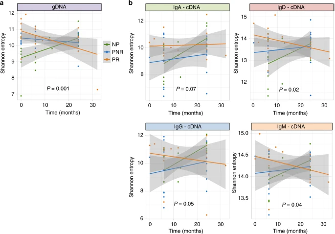 结果发现,NP和PR在移植后的不同时间表现不同,NP的多样性增加,PR的多样性减少,而PNR的多样性在不同时间保持不变。这在gDNA(丰富度:p值=0.007,熵值:p值=0.001,图3a)和cDNA的所有同型中都观察到了,其中IgM和IgD的熵值差异最显著(IgA: p值=0.07,IgD: p值=0.02,IgG: p值=0.05,IgM: p值=0.04,图3b)。