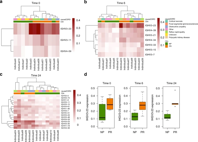 通过了错误发现率(FDR)多次检测校正。发现在NP与PR的比较中,IGHV3-23在所有三个时间点上都是最显著和最丰富的基因(时间0:p值=0.04,时间6:p值=0.003,时间24:p值=0.02)(图6d)。