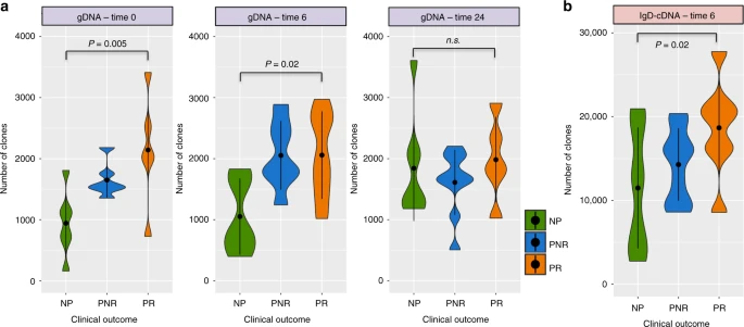 以及移植后优势克隆子集的进一步扩展(p值[线性回归]<0.05,图5)。如前所述,PNR组介于NP和PR之间,尽管在time24时,这一时间与NP组有显著差异(p值[线性回归]<0.05)。虽然图5的数据是由gDNA数据生成的,但cDNA的IgM同型显示出相同的差异(p值[线性回归]=0.05)(补充图8)。