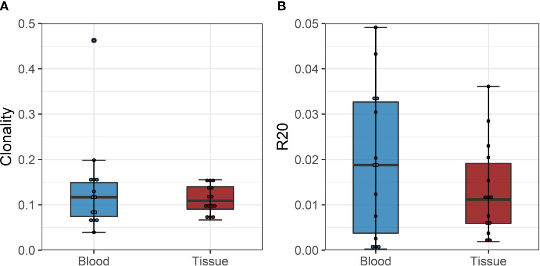 R34和R43浸润TCR免疫库的R20分别为0.038和0.023,克隆性分别为0.042和0.055。这些值与观察到的外周TCR免疫库值相当(图4)。