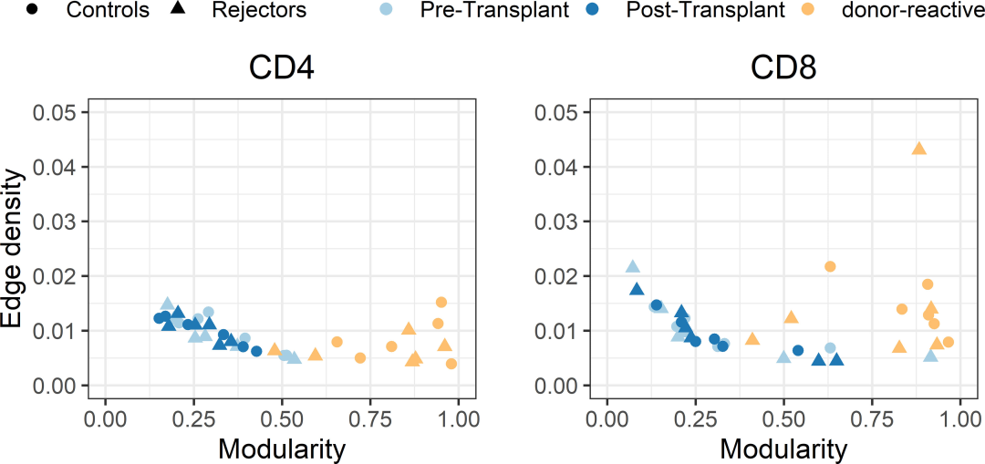 供体-反应性免疫库的个体特异性网络显示出比移植前网络更高的模块化(配对学生T检验;P<0.001;CD4和CD8)和移植后的指标(配对学生T检验;P<0.001;CD4和CD8),表明形成的簇内具有更紧密的连通性(图7)。此外,在边缘密度方面,两个时间点或供体反应库之间没有明显差异(方差分析;CD4细胞 p=0.149, CD8细胞 p=0.095)。这是网络中整体连通性的度量,这表明,尽管根据不同时间点和供体-反应库的边缘密度无法测量实际连接的可观察到的增加,但供体-反应性免疫网络的连接主要分组在集群中(密集连接的节点组),集群外的连接稀疏。相比之下,循环整体TCR库的低模块化值表明异质性连接模式,而没有形成高度连接的拓扑簇。综上所述,这表明了供体特异性免疫网络的更强的细分,将克隆型分为具有相似CDR3序列的群体。图7右面板中的异常值是影响图理论特征的低克隆型计数的CD8库。