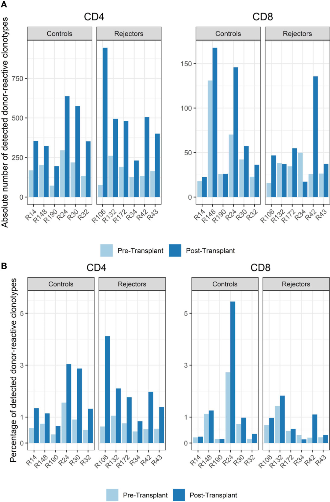 作者没有发现排斥反应患者的外周血供体特异性库与对照组有差异,但在所有移植受者中,这些供体反应性细胞的增加并没有伴随着总体库的显著变化。