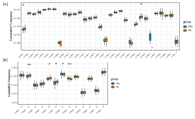通过进一步评估了基线样本中V型和J型TCR基因的使用模式,以确定可能与AR风险增加相关的差异基因使用(补充图1A, B)。可以观察到AR受试者中TCRBV01和TCRBJ01-02的使用增加(p<0.05, Wilcoxon秩和检验)。