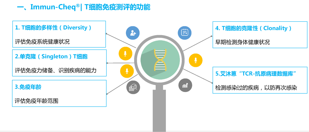 Immun-Cheq® | T细胞免疫测评基于ImmuHub®免疫组二代高通量测序技术平台,通对受检者血液中的T细胞进行TCR测序分析,从而监测T细胞的多样性(Diversity)、单克隆T细胞(Singleton T)、免疫年龄以及T细胞克隆性(Clonality)和对疾病相关的TCR筛选,进而分析受检者的免疫系统和身体健康状况。