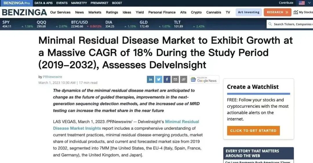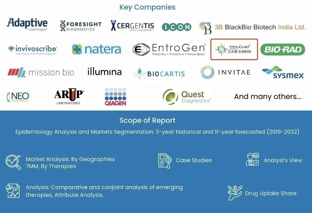 DelveInsight是一家领先的医疗保健市场研究和商业咨询公司,以其现成的联合市场研究报告以及为医疗保健行业的公司提供的定制解决方案而闻名。 根据此次发布的报告可知,MRD市场预计在2019-2032年的研究期间显著增长,年复合增长率(CAGR)预计高达18%。 报告评估了当前市场状况,并预测了MRD市场未来的趋势和增长机会。它突出了推动市场增长的关键因素,例如人们对MRD测试及其优势的认识增加、癌症患病率增加以及技术的进步。调研人员根据技术、应用和终端用户对市场进行了分割。它涵盖了各种MRD测试技术,例如流式细胞术、聚合酶链反应(PCR)、下一代测序(NGS)等;应用领域包括血液恶性肿瘤、实体肿瘤等;终端用户包括医院、诊断实验室和研究中心。 此次调研分析不仅提供了MRD市场竞争格局的全面分析。它对市场运营的关键参与者进行了概要介绍,包括F. Hoffmann-La Roche Ltd、Qiagen N.V.、Bio-Rad Laboratories、Inc.、Adaptive Biotechnologies、Inc. ImmuQuad Biotech,LLC等,还包括有关其产品组合、财务表现和最新发展的信息。 总体而言,DelveInsight的报告表明,在研究期间,MRD市场面临着显著的增长机遇,驱动因素包括癌症患病率增加和MRD测试技术的技术进步。