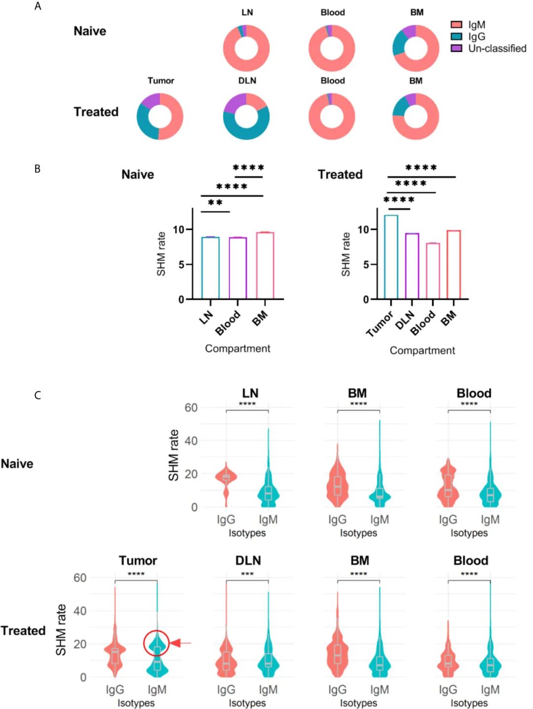 为了进一步探索指示B细胞激活状态的库测量值,作者分析了不同同种型的每个组织中的SHM率。发现TIL-B室的SHM率(12个突变的平均值)显著高于DLNs、骨髓和血液。令人意外的是,在SHM率很高同时TIL-Bs却是以IgM为主的。