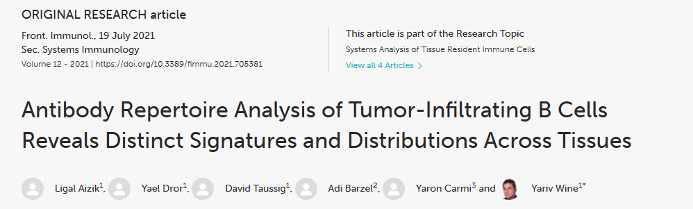Aizik L, Dror Y, Taussig D,Barzel A, Carmi Y and Wine Y(2021) Antibody Repertoire Analysis of Tumor-Infiltrating B Cells Reveals Distinct Signatures and Distributions Across Tissues. Front. Immunol. 12:705381.doi: 10.3389/fimmu.2021.705381