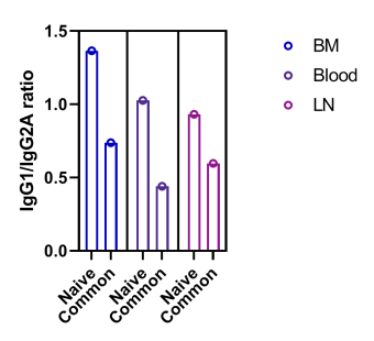 最后,小鼠产生四种IgG亚类,即IgG1、IgG2A、IgG2B和IgG3。具体来说,有研究表明,IgG1/IgG2A频率比低反映了Th1应答高于Th2应答。IgG1的产生在Th2细胞因子IL-4的作用下升高,IgG2A的产生在Th1细胞因子IFN-g的作用下升高(45,46)。为了检查在普通克隆中发现的IgG1与IgG2A频率比率的任何变化,我们计算了naïve小鼠骨髓、血液和淋巴结中B细胞中的IgG1/IgG2A比率,并将其与肿瘤小鼠(即肿瘤和骨髓、血液或DLN共有的克隆)中上述每种组织类型的肿瘤常见克隆中的比率进行了比较。作者发现,普通克隆中的IgG1/Ig2A比例平均比naïve小鼠中的比例低两倍(补充图S4)。