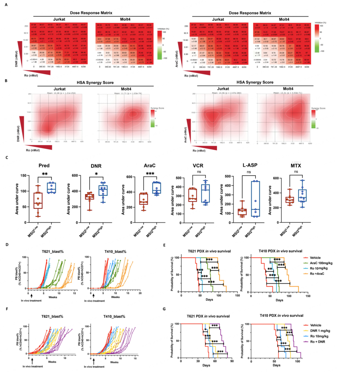 体外药理模型和小鼠体内实验表明,MSI2功能抑制剂(Ro 08-2750)与T-ALL诱导及巩固化疗中重要的细胞毒药物柔红霉素和阿糖胞苷具有显著的协同作用,Ro 08-2750联合化疗药物,能够延缓白血病细胞的体内扩增并显著延长白血病模型小鼠生存时间,该发现为儿童T-ALL靶向治疗联合化疗克服耐药及复发提供了新思路(图2)。