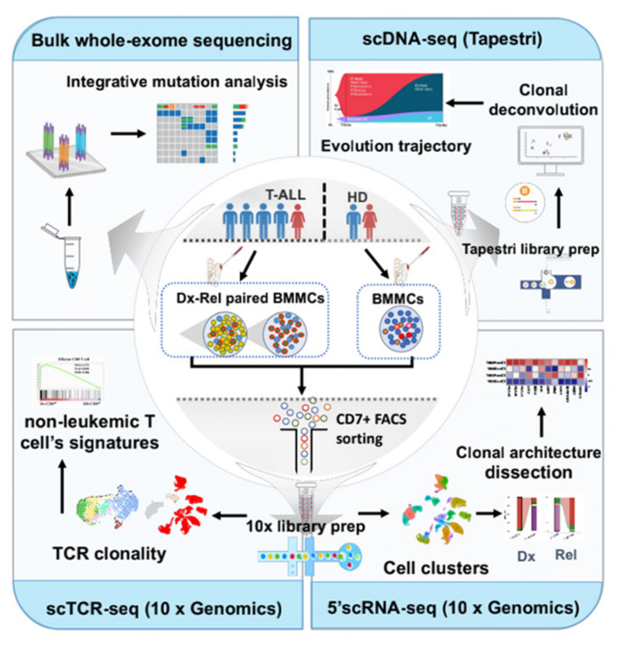 本研究创新性结合scRNA-seq与scTCR-seq,旨在使用tapstri平台来描绘T-ALL异质性、克隆性和非白血病T细胞在配对的初诊-复发(Dx-Rel)患者中的特征