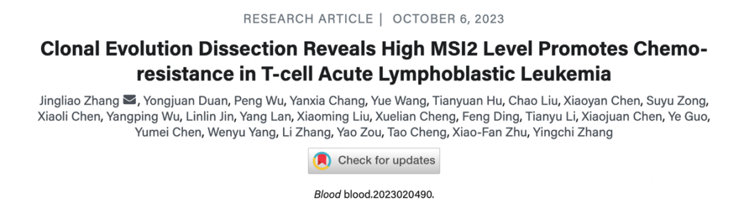 2023年10月6日,中国医学科学院血液病医院(中国医学科学院血液学研究所)竺晓凡、张英驰及章婧嫽共同通讯在Blood(IF=20)在线发表题为“Clonal Evolution Dissection Reveals High MSI2 Level Promotes Chemo-resistance in T-cell Acute Lymphoblastic Leukemia ”的研究论文,此研究利用单细胞多组学技术解析了儿童T-ALL的白血病克隆演化模式,揭示了克隆演化过程中RNA结合蛋白MSI2通过调控癌基因MYC表达诱导化疗耐药的分子机制。